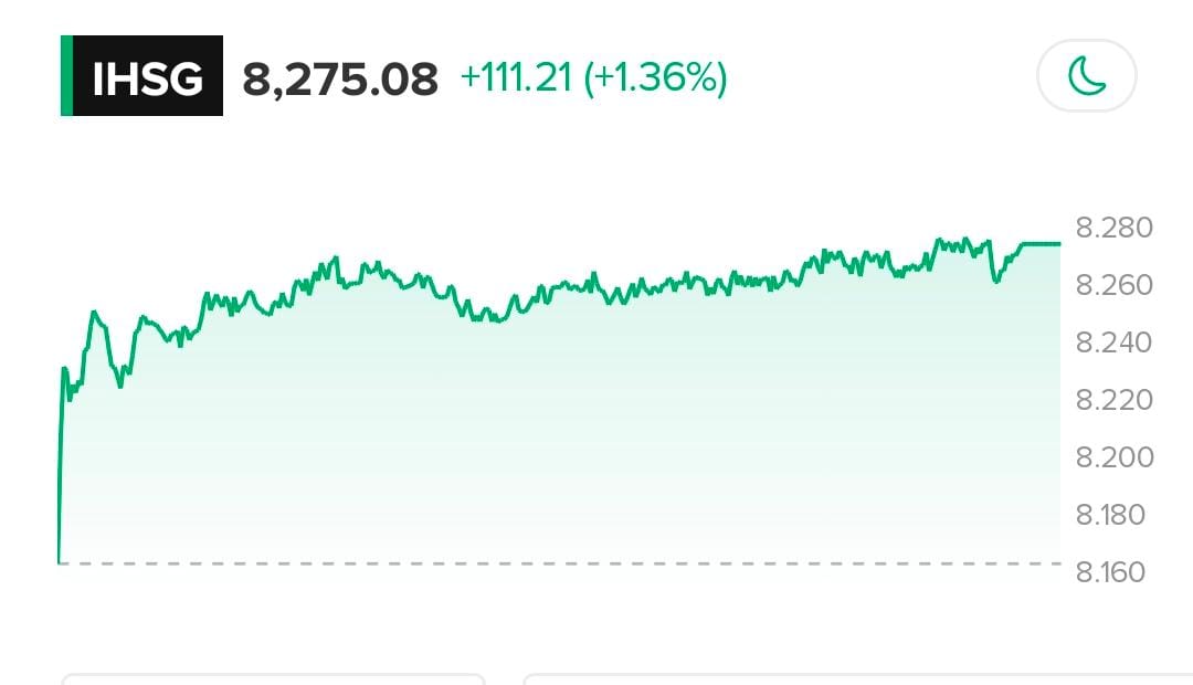 Jakarta — Indeks Harga Saham Gabungan (IHSG) mengawali pekan ini dengan penguatan signifikan sebesar 1,36 persen atau naik 111,21 poin, menutup perdagangan di level 8.275,08 pada Senin (3/11). Kenaikan ini mencerminkan meningkatnya optimisme pelaku pasar terhadap stabilitas ekonomi nasional menjelang akhir tahun.